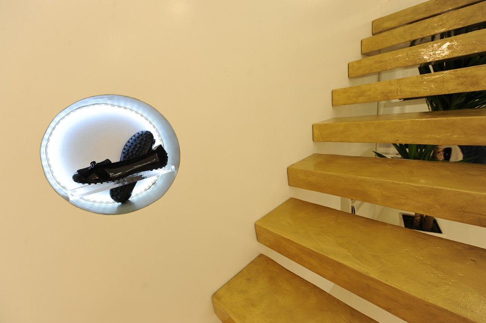 Il bianco predomina, contrastato solo dalla scala di collegamento in resina color oro, bianco il pavimento, anch’esso in resina, bianche le pareti, bianchi gli arredi.